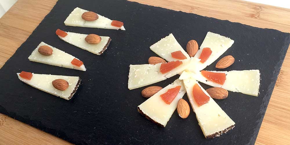 象牙色のマンチェゴにメンブリージョのオレンジ色が映え、チーズの塩味とコクに対するメンブリージョの甘味と酸味のバランスが心地良い伝統的なチーズプレート