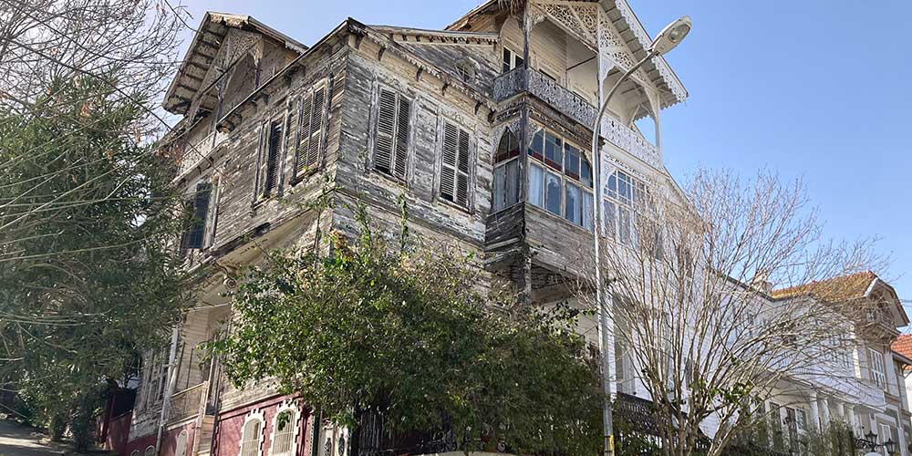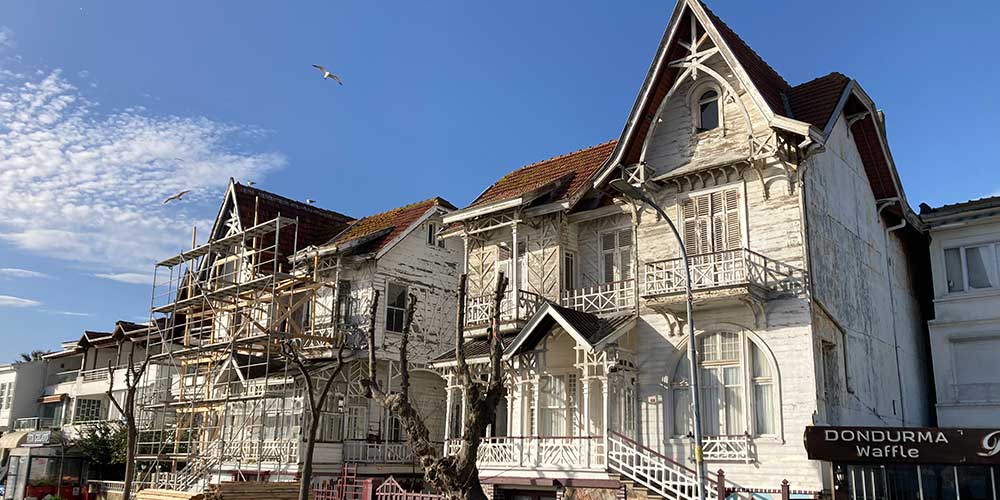 素朴さとビーチの美しさで人気なのが、一番小さなクナルアダ。港を出ると、左手には左右対称に建てられた木造3階建アルメニア建築の「スィラクヤン・イキズ・エヴレェリ(Sirakyan İkiz Evleri)/双子の家」があります。急勾配の屋根、窓やドアのデザインなど、細部にまでこだわった美しい姿で私たちを出迎えてくれます。