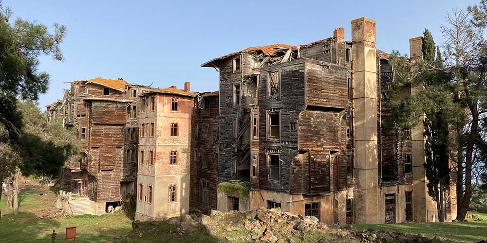 © tomoedagli 見どころは、ヨーロッパでは最大、世界でも2番目に大きい木造建築物といわれる、ビュユックアダの丘の上に残る木造5階建て建築「ルム・イェティンハーネスィ(Rum Yetimhanesi)」。 港から30分ほど坂道を上ると、この歴史的遺産を目にすることができます。当初はホテルとして建てられたものの必要な許可が下りなかったため、1903年から1964年までギリシャ人の孤児院として運営されていました。現在ではかなり老朽化が進み、柵に覆われて立ち入り禁止の状態となっていますが、柵の外からでも十分に全体像を眺めることができます。 木造5階建て建築、ルム・イェティンハーネスィ